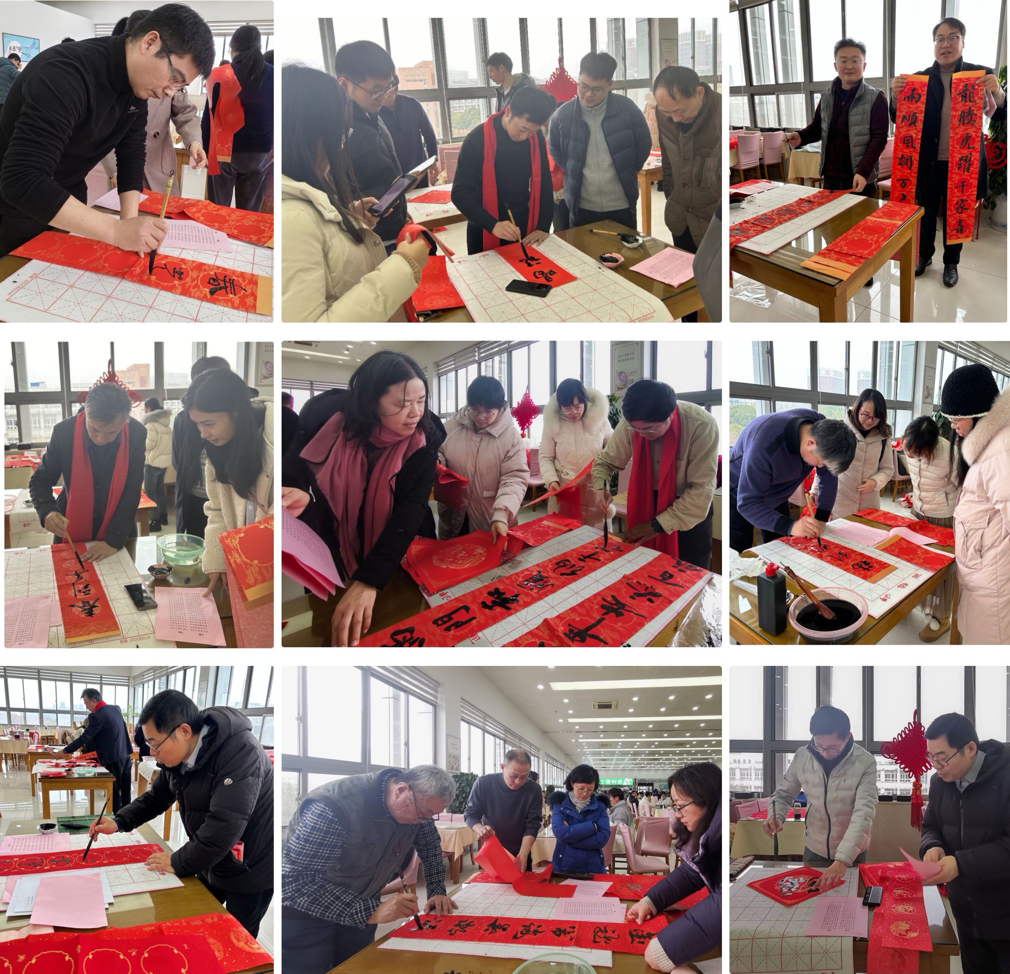 活动现场墨香满溢,热闹非凡,教职工们围绕在书画协会的老师们周围,争相邀请他们为自己写上对新春的期盼和对美好幸福生活的向往。两个多小时的时间,老师们全情创作,挥毫泼墨,妙句成双,将祝福浓缩于字里行间,或苍劲有力,或飘逸隽秀,楷、行、隶、篆、草各式各样的书体跃然纸上,迎祥纳福,令人大饱眼福。对联幅幅充满春意,字字饱含深情;现场满桌“福”气,暖意融融。