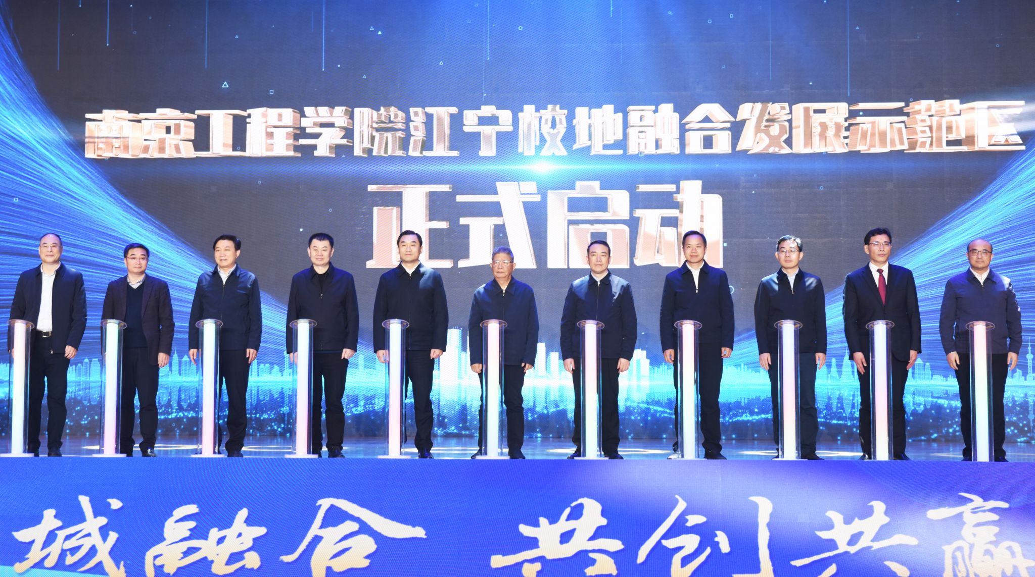在与会人员的共同见证下,张仰飞与黄成文分别代表校地签订全面深化战略合作协议。江宁校地融合发展示范区同时正式启动,双方将整合南工程应用型高校的科教资源优势和江宁区的产业优势,以现有的新型研发机构、高等级平台、科技创业企业、大学科技园、技术转移中心、知识产权运营中心、产业学院和地方产业急需高水平应用型人才培养为基础,建成立足江宁、南京,辐射江苏的政产学研用为一体的校地融合发展示范区,打造全省领先、全国知名的校地融合发展典范区,共建“世界电谷”。