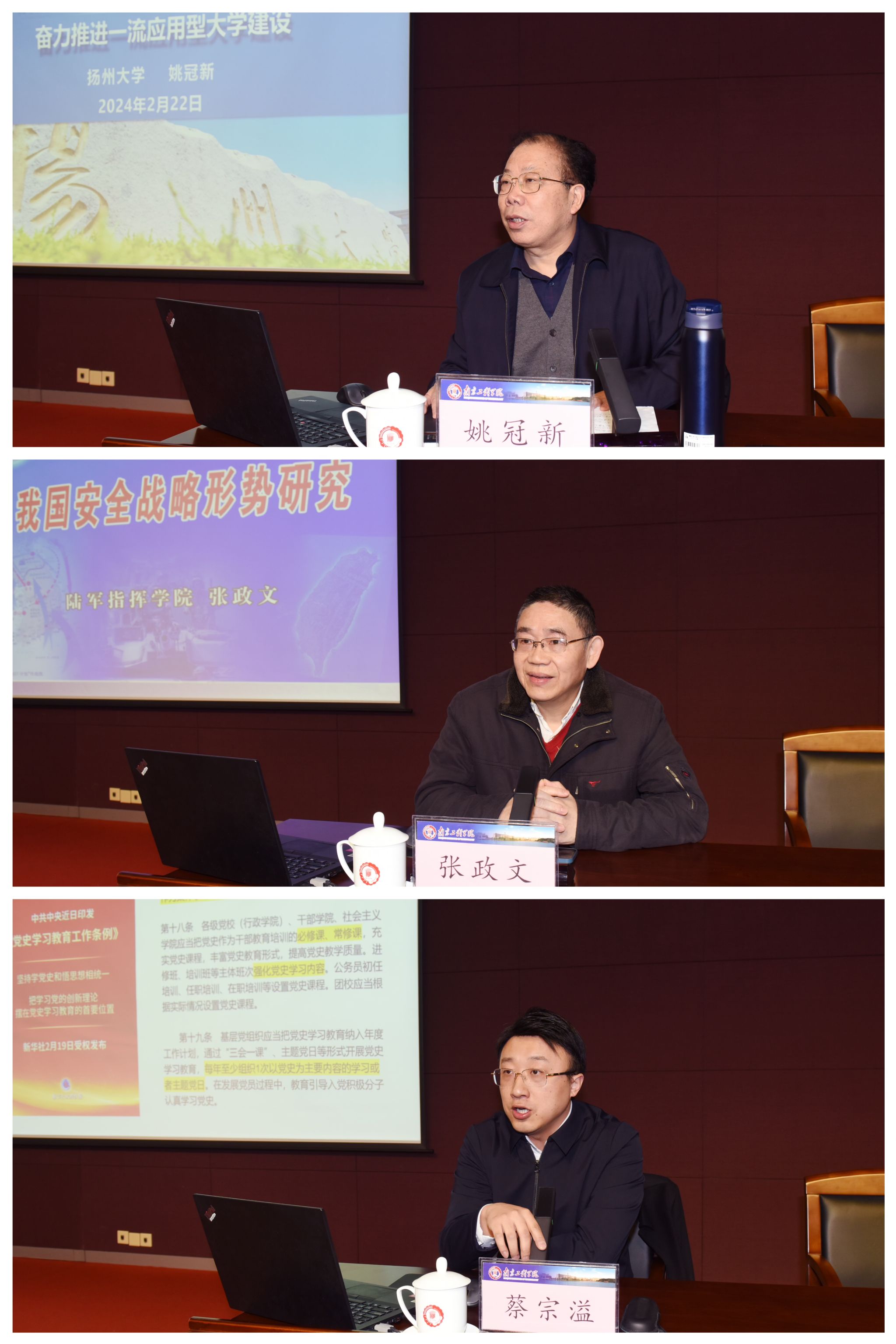 培训会上,扬州大学原党委书记姚冠新教授以《解放思想再出发 转型发展开新局》为题,从高等教育当前形势与发展趋势、高校发展战略谋划与战略定力、高校中层干部执行力的重要性与紧迫性、关于应用型高校转型发展的思考等四个方面进行了详细阐述;解放军陆军指挥学院张政文教授作《我国安全战略形势研究》专题报告,他结合时事案例重点分析了我国的安全战略形势,同时解读了我国为保障国家安全、捍卫核心利益和维护国家权益所采取的一系列有效策略;江苏省委党校蔡宗溢副教授以《遵义会议前后的周恩来及其精神风范》为题,通过对历史细节的解构,从遵义会议前后的关键问题、周恩来同志的丰功伟绩、周恩来同志留下的宝贵精神财富等三个方面,立体描绘了周恩来坚持真理、实事求是,顾全大局、对党忠诚,自我革命、严于律己的高贵品质。三位专家的报告高屋建瓴,主题鲜明,对进一步强化干部政治理论素养和岗位履职能力建设具有重要的指导意义。