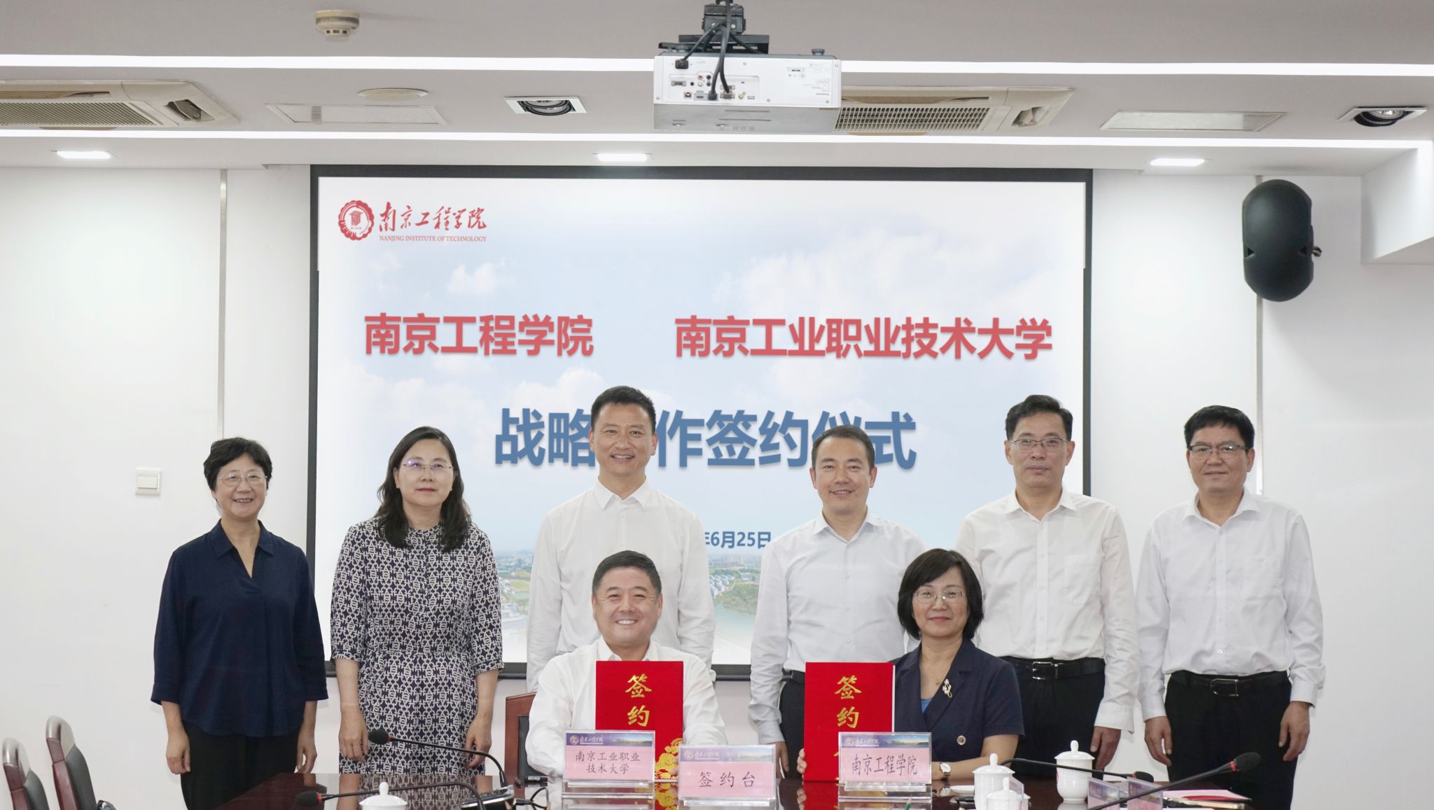 6月25日,我校与南京工业职业技术大学战略合作签约仪式在至勤楼·行政中心北303会议室举行,携手开启“校校合作、共谋发展”的崭新篇章。我校党委书记孙爱武,党委副书记、校长张仰飞,党委副书记濮励杰,党委常委、副校长汪群、朱松青、赵文祥;南京工业职业技术大学党委书记、校长谢永华,党委常委、副校长魏萍、苏小冬、孙雁飞、崔新明、潘旭海等出席签约仪式。会议由濮励杰主持。
