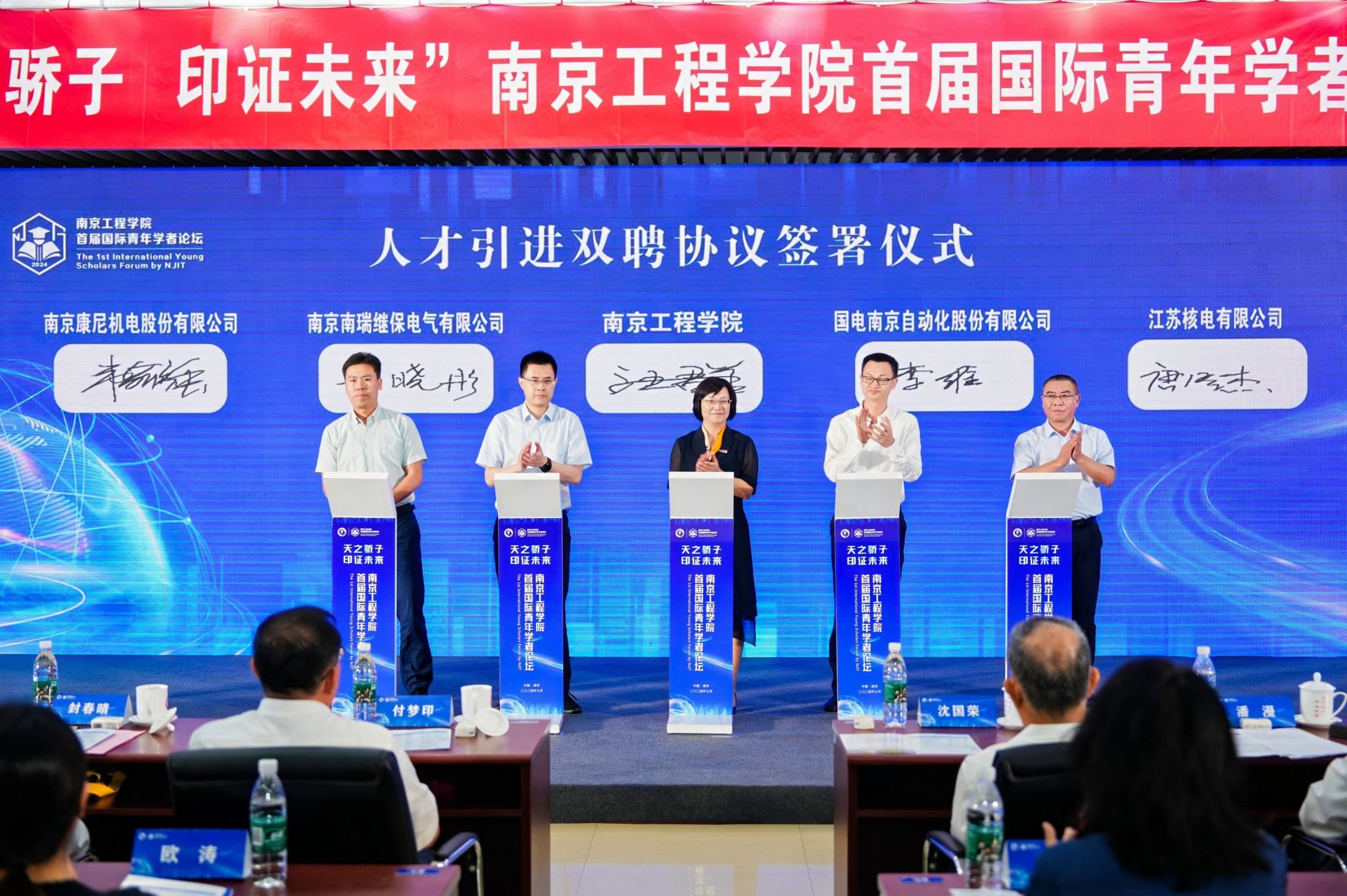 活动现场,江宁区与我校签署人才共引共育共用合作协议。南京南瑞继保电气有限公司、国电南京自动化股份有限公司、南京康尼机电股份有限公司、江苏核电有限公司与我校签署人才引进双聘协议。开幕式上还举行了优秀人才签约仪式。
