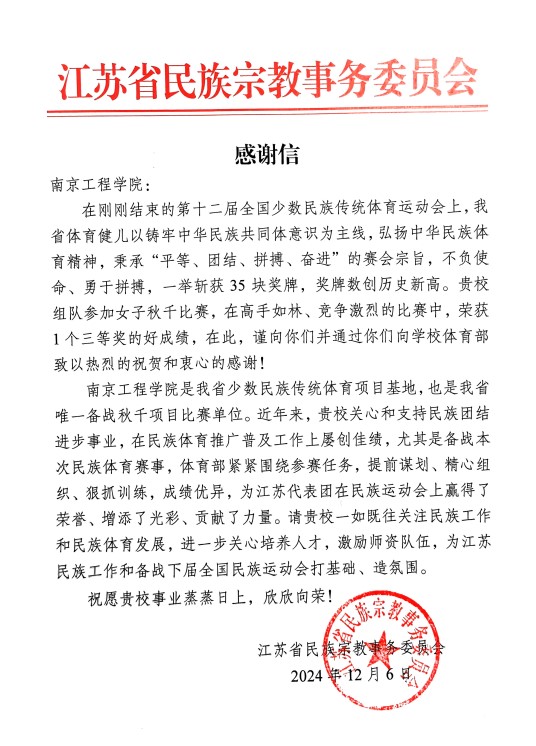 近日,江苏省民族宗教事务委员会向我校发来感谢信,对由我校组建的江苏秋千队在全国第十二届少数民族传统体育运动会中荣获三等奖表示热烈祝贺,向我校长期以来在促进民族团结进步、弘扬中华民族体育精神等方面的不懈努力表示感谢。