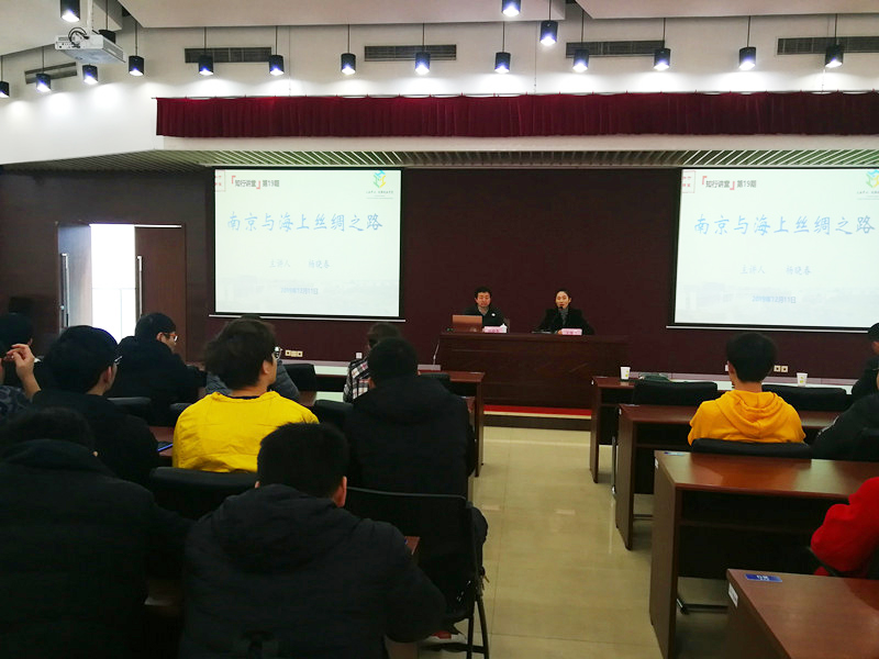 为说明南京在海上丝绸之路的重要地位,杨教授结合海上丝绸之路的一般知识,从南京的自然地理特征和历史文化特征两方面进行分析。回望历史的长河,作为六朝古都与明朝都会的南京,以国家力量成为海上物质文化交流的核心地,是中国海上丝绸之路官方贸易的重要城市。“东晋的《法显传》,六朝墓葬出土的玻璃杯、鹦鹉螺杯等舶来品,明代的《郑和航海图》,静海寺、天妃宫、宝船厂、洪保墓等与郑和下西洋有关的一系列遗存,都充分展示了南京作为海上丝绸之路节点城市的风采”,杨教授说道。他指出,2016年,国家文化局已明确将南京列入海上丝绸之路申遗城市名单,这也标志着南京海上丝绸之路史迹保护、管理迈上新台阶。整场讲座深入浅出、通俗易懂,开阔了师生们的知识面,了解了南京作为海上丝绸之路重要节点城市的历史渊源与现实意义。